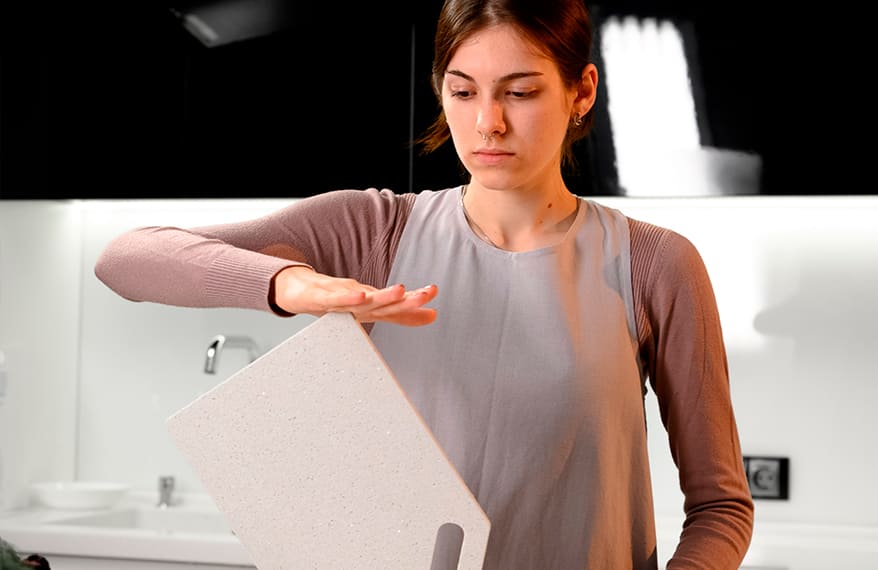 На всіх дошках зі штучного каменю залишаються ПОВЕРХНЕВІ сліди від ножа. Вони не накопичують бактерії та не перетворюються на тріщини. Штучний камінь за своєю структурою - не здатний вбирати запахи, не схильний до утворення тріщин та розмноження бактерій. Рекомендуємо одну сторону використовувати для нарізки, іншу декоративною. Це не обов'язково, тому що подряпини від ножа не критичні, але вони все ж таки є. Саме ця особливість дозволяє вашим ножам залишатися гострими, тому що матеріал м'якіший, ніж лезо ножа і не травмує його.